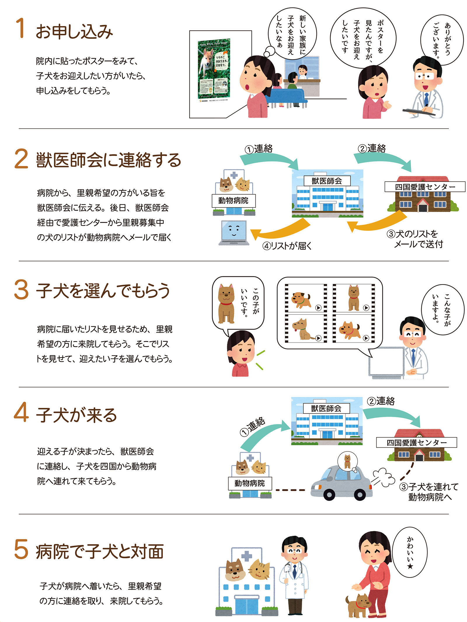 四国は山間部が多く飼い主のいない、いわゆる野良犬が生息しやすい環境です。四国(徳島県)の動物愛護センターに収容され、引き取り手がない子犬を一匹でも多く京都で里親を探すための活動になります。